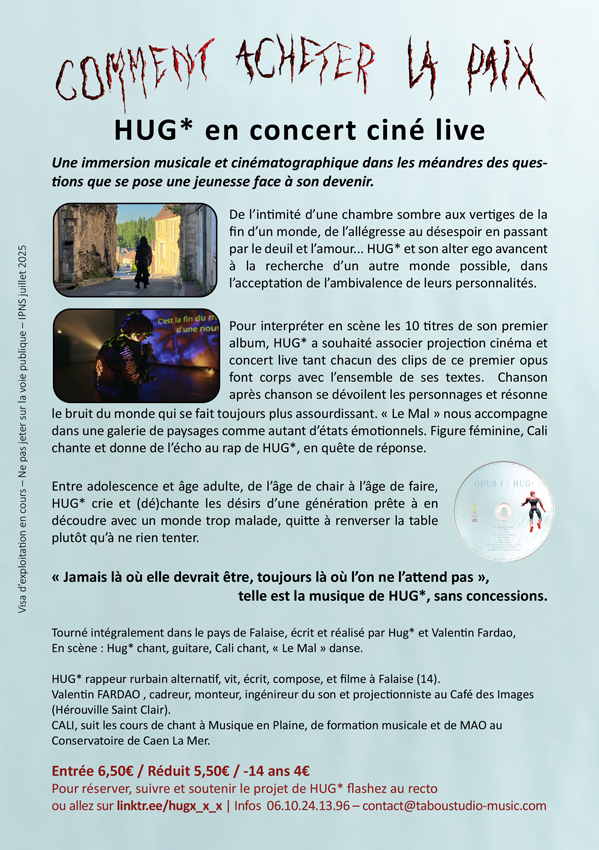 Nous continuons d’accompagner le projet de musique actuelle de HUG* rejoint tout début 2025 par Cali au chant et au backs et Valentin à la régie son et vidéo également à la réalisation des 10 visualizers tournés à l’automne 2024 au Forum de Falaise et qui accompagneront la sortie du premier album de HUG* et du projet de film pour une diffusion en cinéma et dans toutes les bonnes salles en 2026/27.