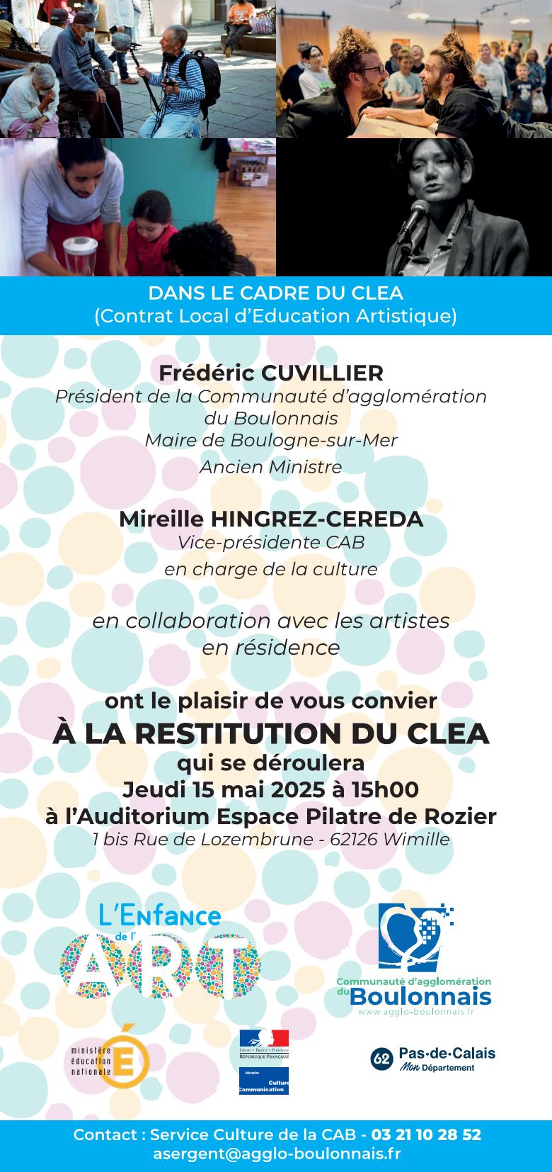 Financée et en partenariat avec la Communauté d’agglomération du Boulonnais, la Direction Régionale des Affaires Culturelles Hauts-de-France (DRAC), le Conseil Départemental du Pas-de-Calais, le rectorat de Lille – Délégation Académique aux Arts et à la Culture (DAAC) et la Direction des Services Départementaux de l’Education Nationale – (DSDEN – Pas-de-Calais)